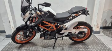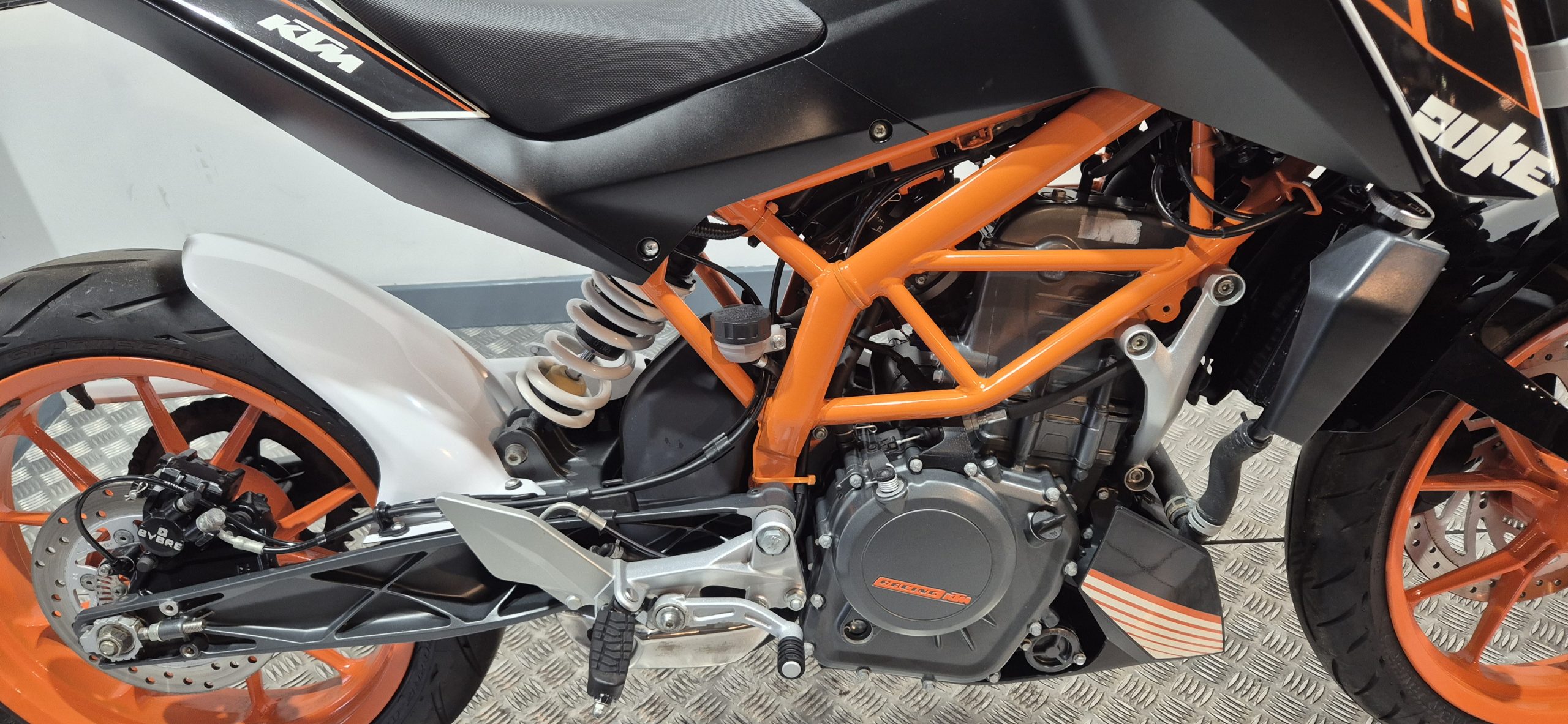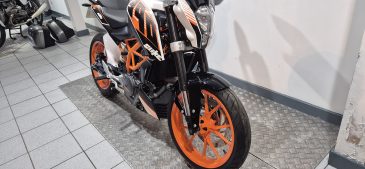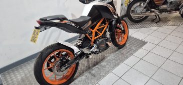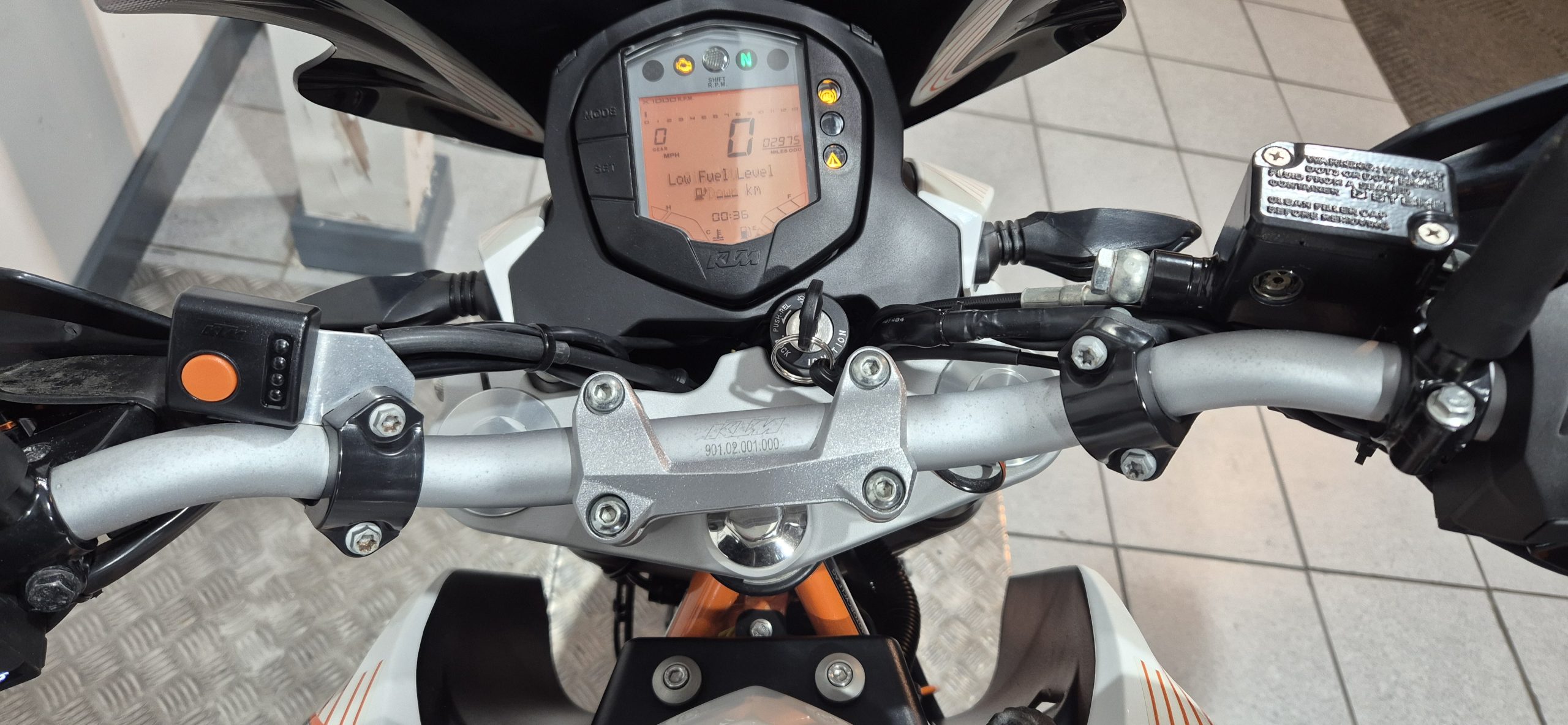 KTM 390 Duke in white and orange. In beautiful condition and having covered only 2975 miles. 2 owners. Fitted with heated grips, adjustable levers and hugger. 2 Keys and handbooks. 12 months MOT.