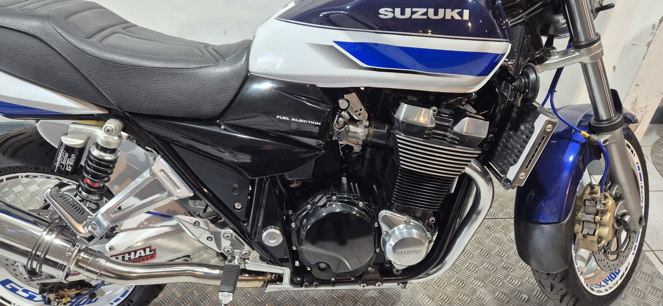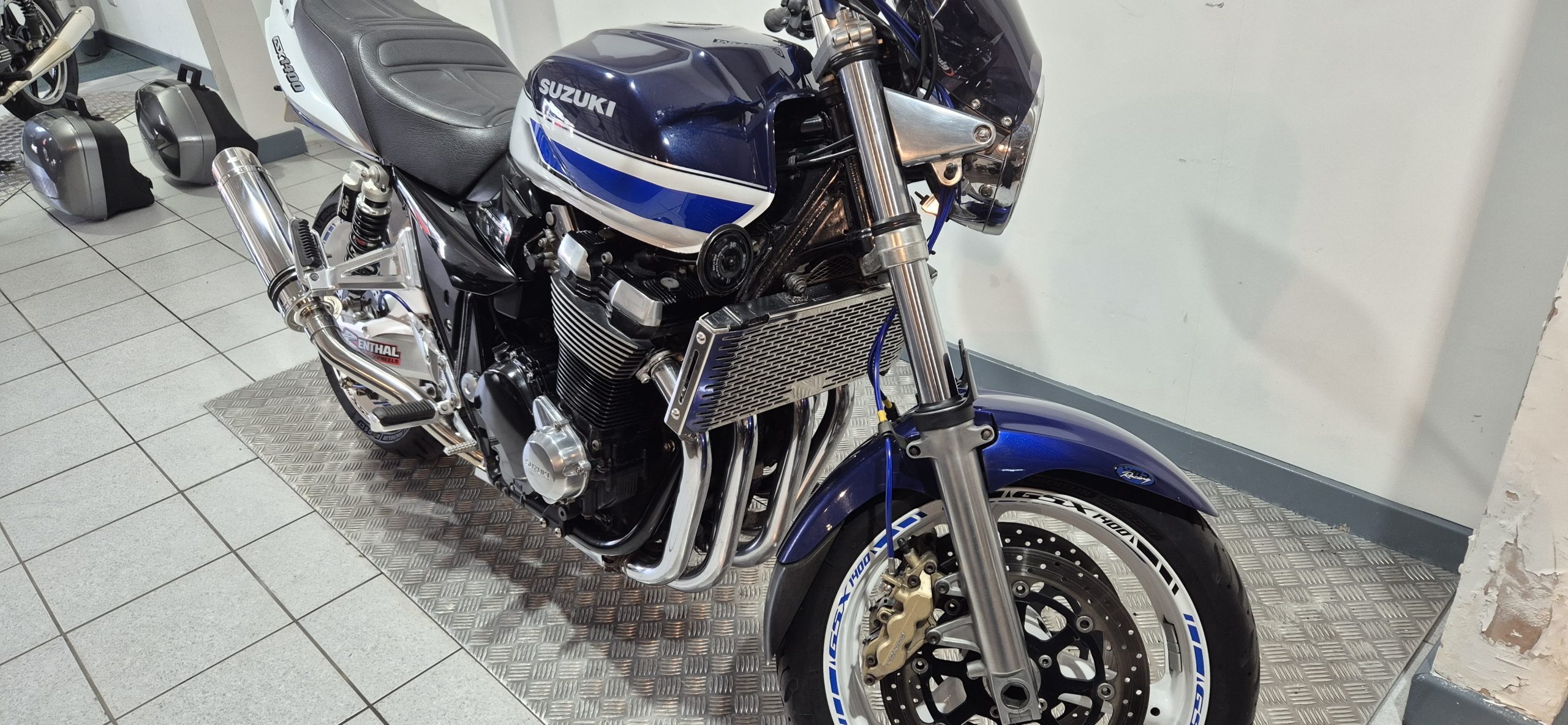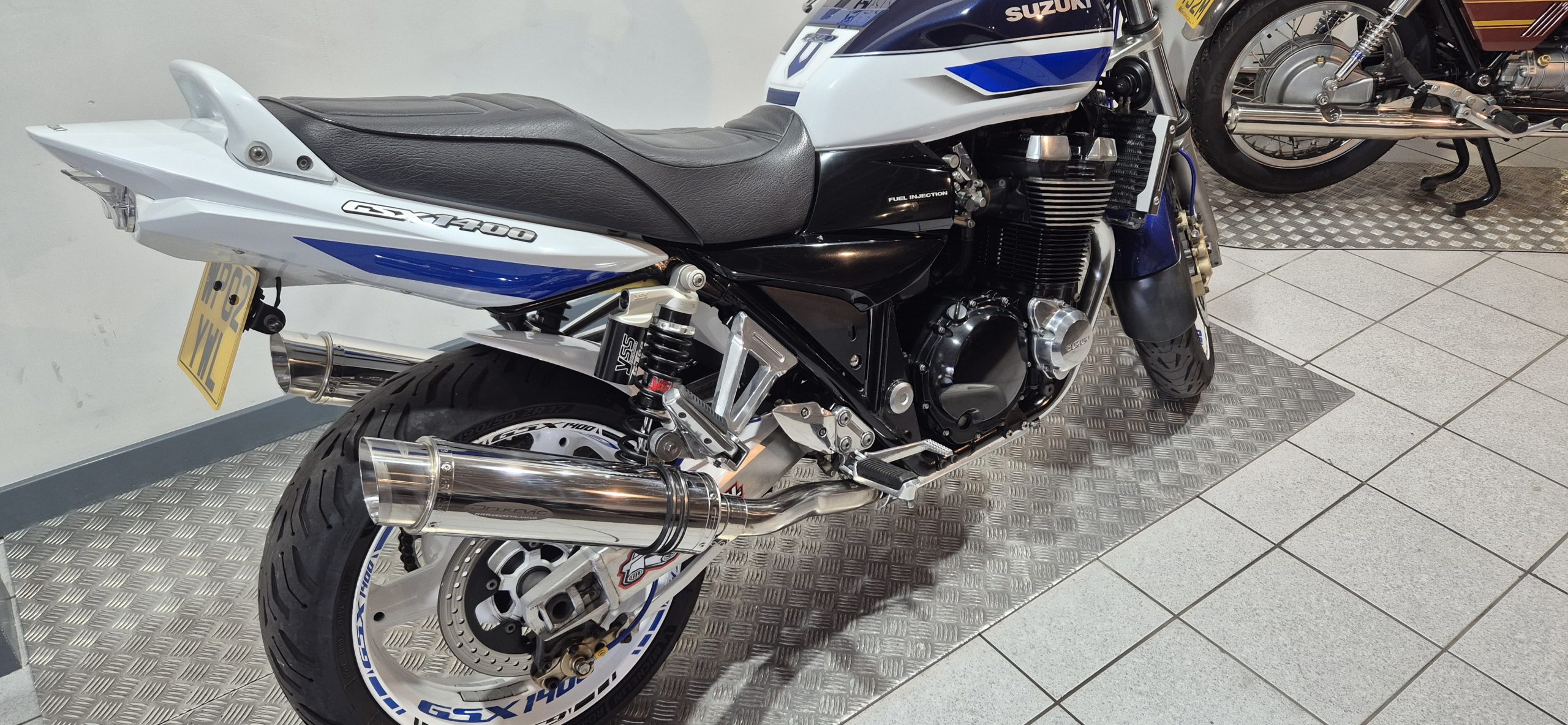 Suzuki GSX1400 in Blue and White, having covered only 33831 miles from new. In lovely condition and fitted with Delkevic silencers, YYS shocks, braided hose and Renthal bars. MOT until March 2027.